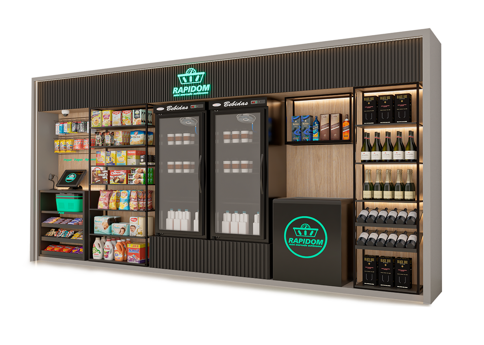 A instalação de um minimercado autônomo em seu condomínio é adaptada a espaços existentes, como salas, corredores ou áreas compartilhadas, como um salão de jogos.
